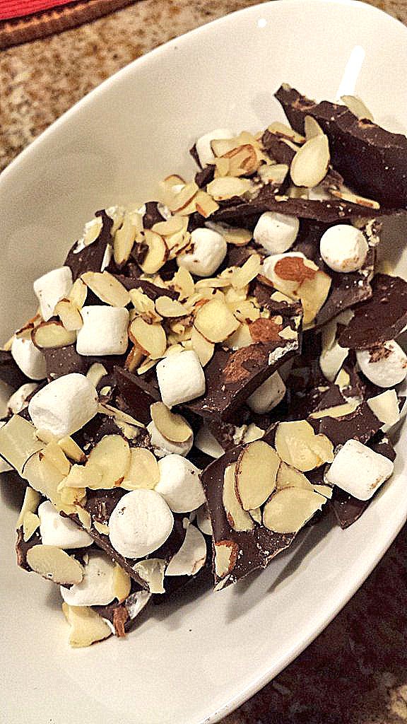 Once all of the chips are melted removed the bowl from the heat. Use a rubber spatula to transfer the chocolate to your lined baking sheet. Next, use a flat edge spatula to evenly spread the chocolate. Then, add the marshmallows, almonds and sea salt. Place the baking sheet in the refrigerator for at least an hour allowing the chocolate to harden. When ready to serve, use a butter knife to break the bark into jagged pieces. Since you used cooking spray and parchment paper, you can use a good knife to cut even shapes too.