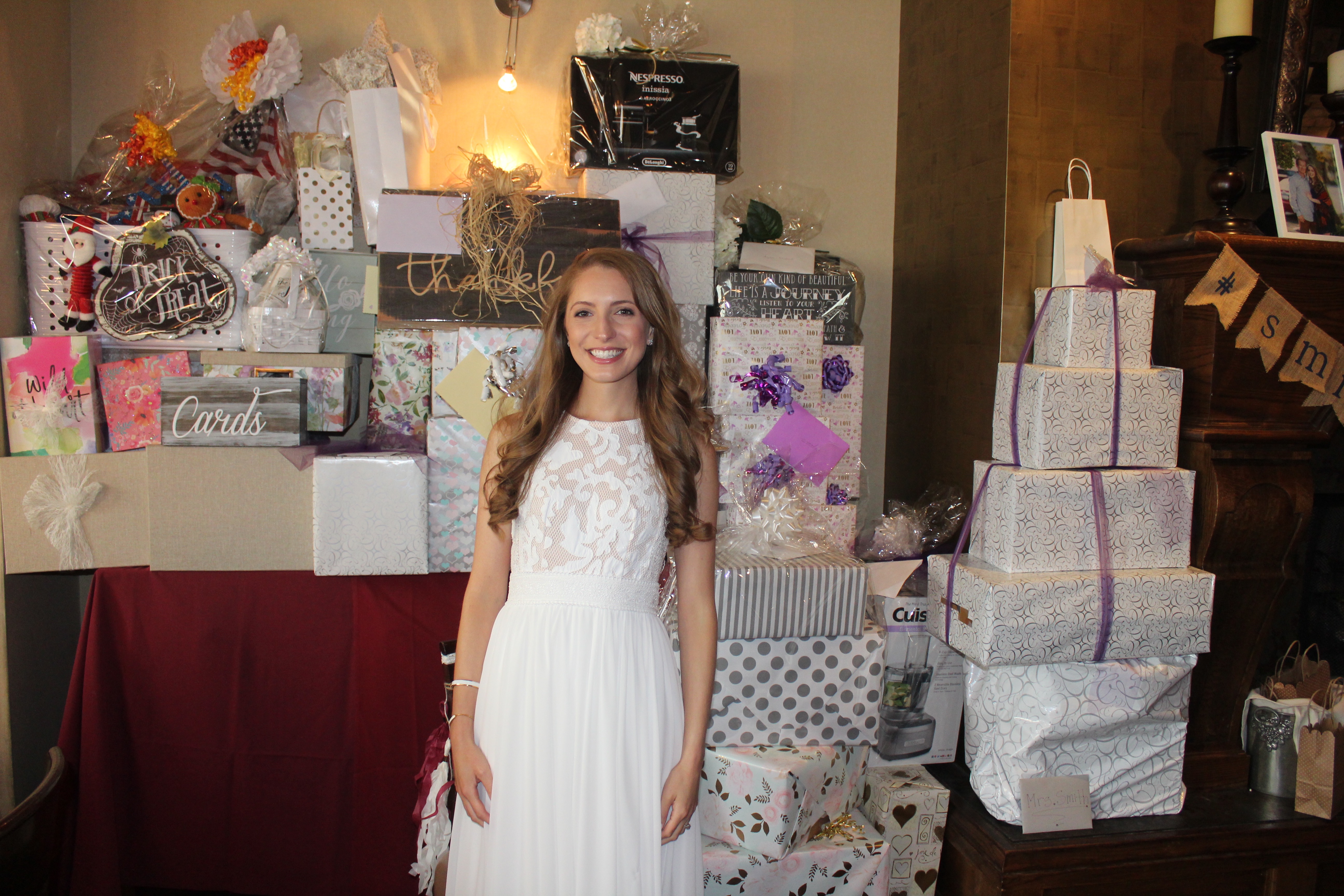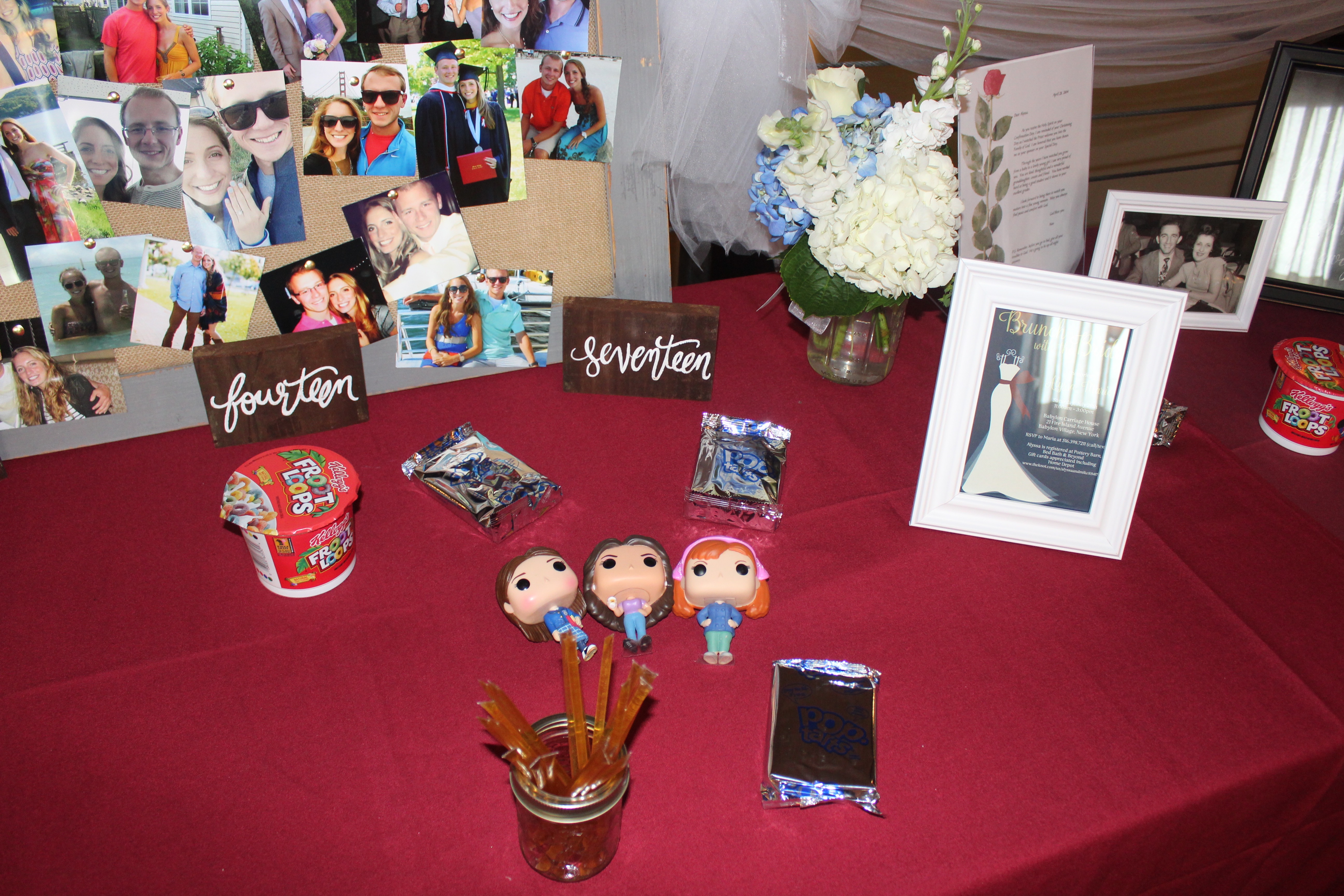 My mom didn’t miss a single detail. My shower was Pinterest perfect. We both LOVE the Gilmore Girls, so she incorporated so many details from the show. She made chocolates covered in Gilmore Girl’s sayings, decorated the tables with Fruit Loops and Pop Tarts, the center pieces were filled with coffee beans and she even found Gilmore Girls bobble heads! I love how much my mom personalized my shower because it made my day extra special. She and my bridesmaids put together so many pictures, including a “Meet the Maids” scrapbook. I love to cook, so my mom also sent out recipe cards with my invitations and collected them in a wooden recipe box. I can’t wait to continue collecting recipes from friends and family. My mom included a few special gifts such a toasting flutes, cake forks, a piece of my grandma’s shirt {something blue} to sew into my wedding dress and my christening bonnet from my great aunt {something old}.