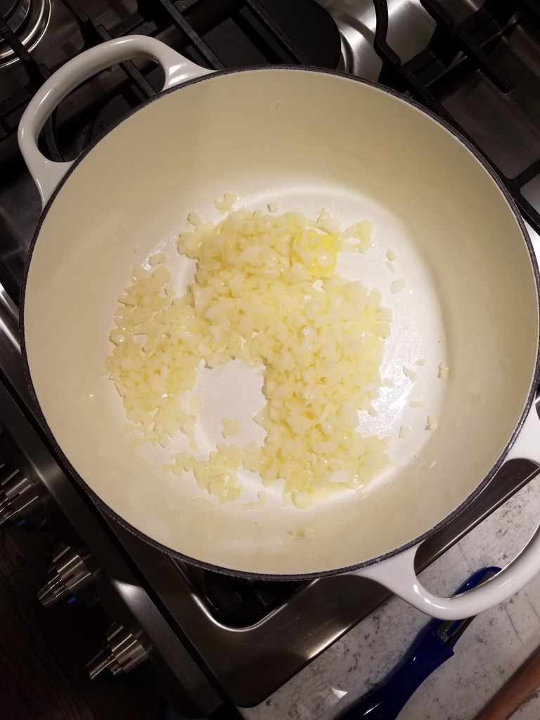 - Melt butter in Dutch oven then add chopped onions and cook until softened.