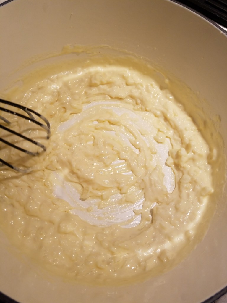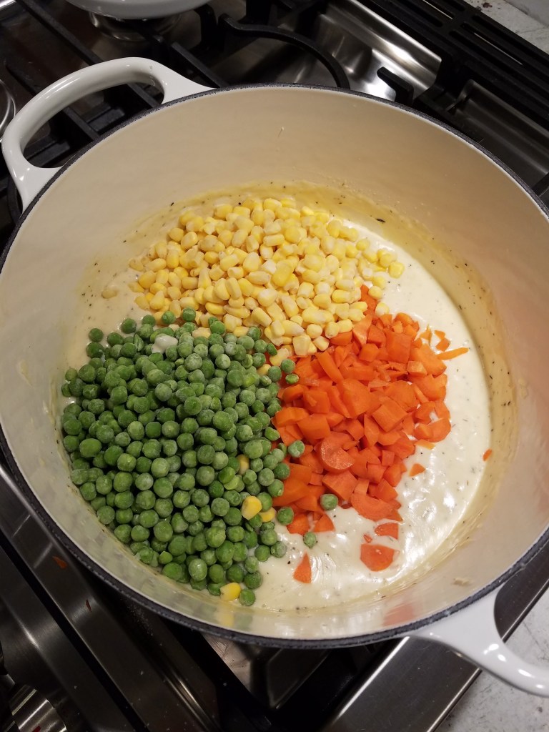 I did a little research on chicken pot pie recipes to better understand how to make one from scratch. My main goal was to make sure it turned out as delicious as my mom’s. From my research I learned a Bechamel sauce would be a key player in the perfect consistency. It’s a white sauce made from butter, flour, and milk or cream. It is common in meals that have a thick, creamy consistency. I am so proud of how this recipe turned out. I didn’t just like this dinner; I loved it! I felt like I could have sat at the table all night eating. I was also used just one pot for this whole meal — my beloved Le Creuset Dutch oven.