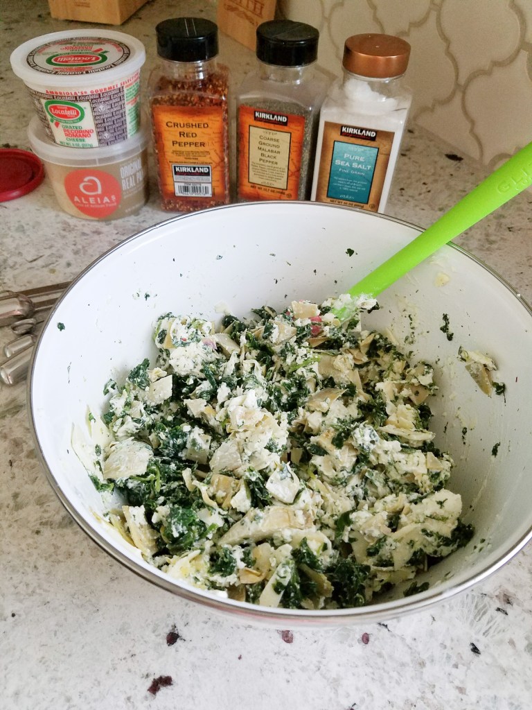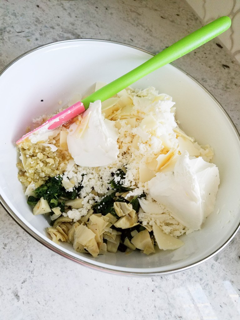 4. In a medium size bowl combine spinach, artichoke, mozzarella, smoked gouda, 1/4 cup Pecorino Romano, cream cheese, sautéed onions and garlic. Season with black pepper, red pepper and salt (remember, pecorino Romano and parmesan can make a dish salty, so be mindful of the extra salt you add).