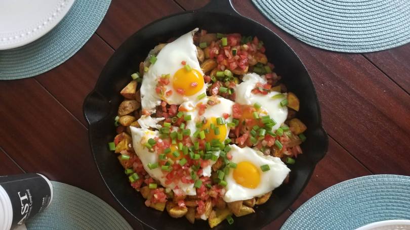 Next, up – the eggs! I cracked five organic eggs over the top of the potato-chorizo mixture and placed a lid over the top to cook them through. I love breakfast food; especially perfectly cooked eggs with a thick runny yolk.